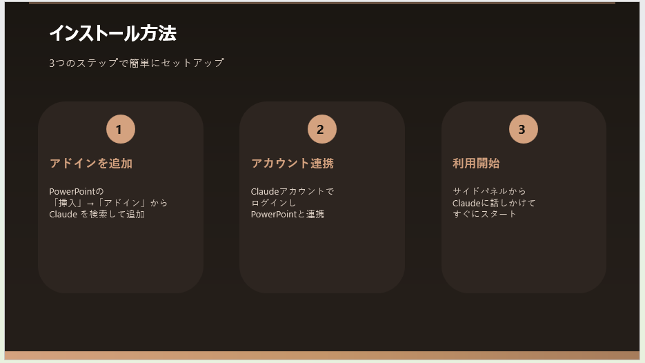 ひとことで言うと、「PowerPointの中でClaudeと会話しながら資料が作れる」というものです。