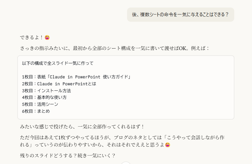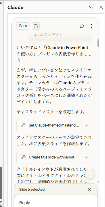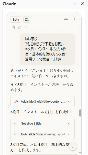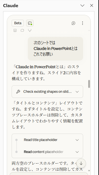 「次のシートではClaude in PowerPointとはこれでお願い」とシンプルに指示したら、またすぐに動き出してくれました。