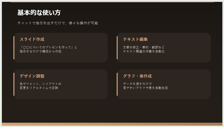 - 会話しながら修正できる(「もっとシンプルにして」もOK)
