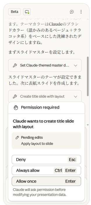 Claudeがスライドを編集する前に「ほんまにやっていいですか?」と確認してくれる仕組みになっています。