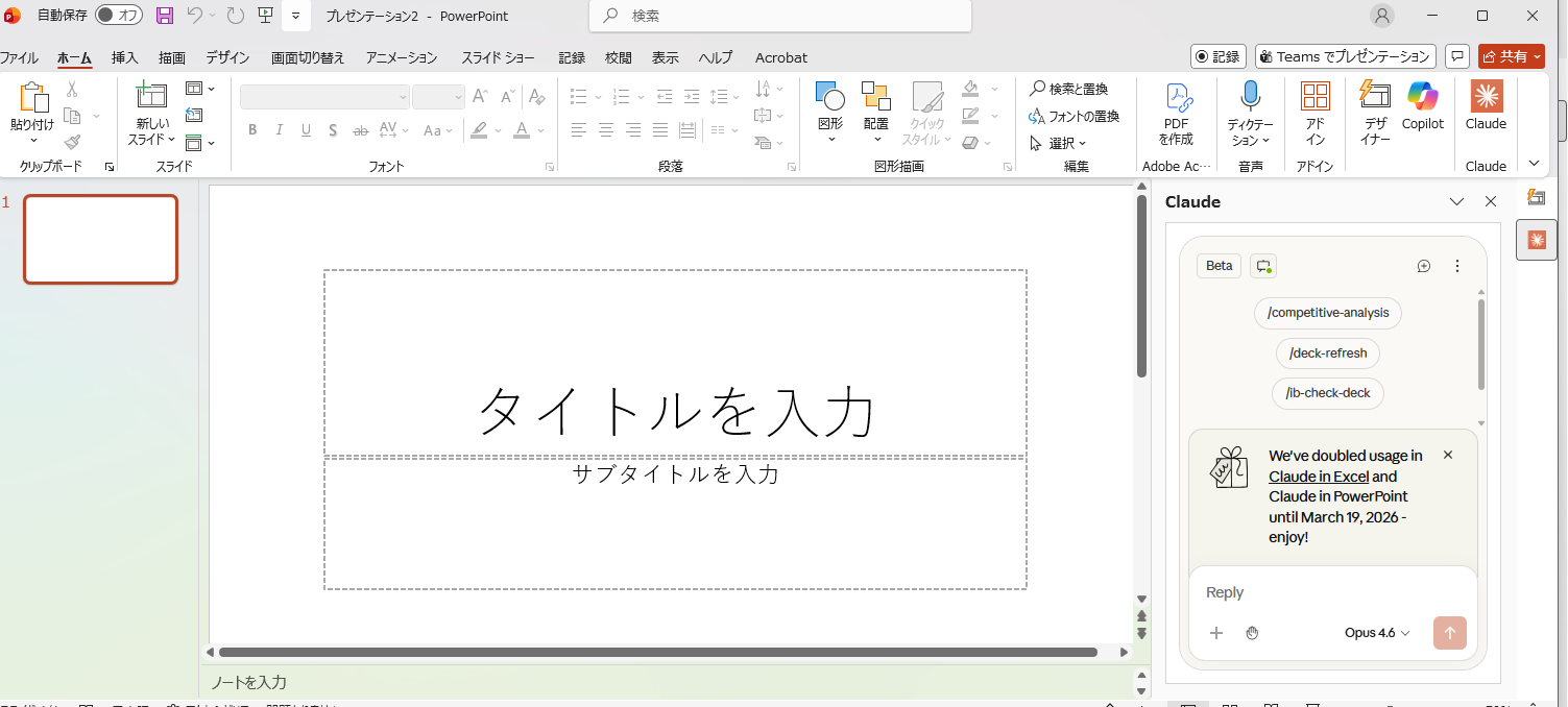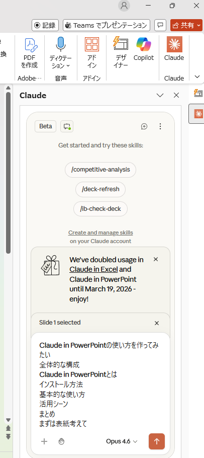 ちなみに今(2026年3月19日まで)はキャンペーン中で、Claude in PowerPoint使用時の利用上限が通常の2倍になってるのでお得に試せるタイミングです!