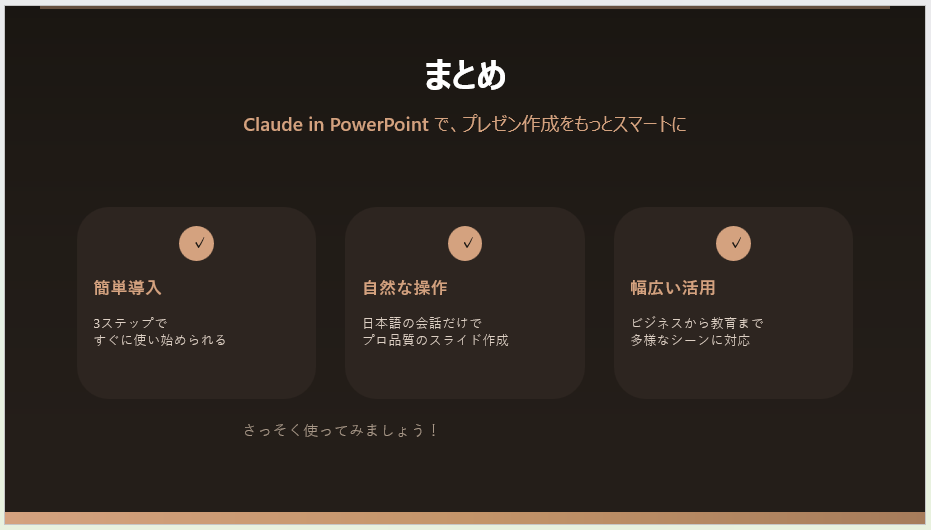 これまでは「ChatGPTで文章考えて、PowerPointに貼って、デザイン整えて…」と行き来が大変でしたよね。Claude in PowerPointは、PowerPointを開いたまま、右側のサイドパネルでClaudeに話しかけるだけでスライドを作ったり編集したりできます。