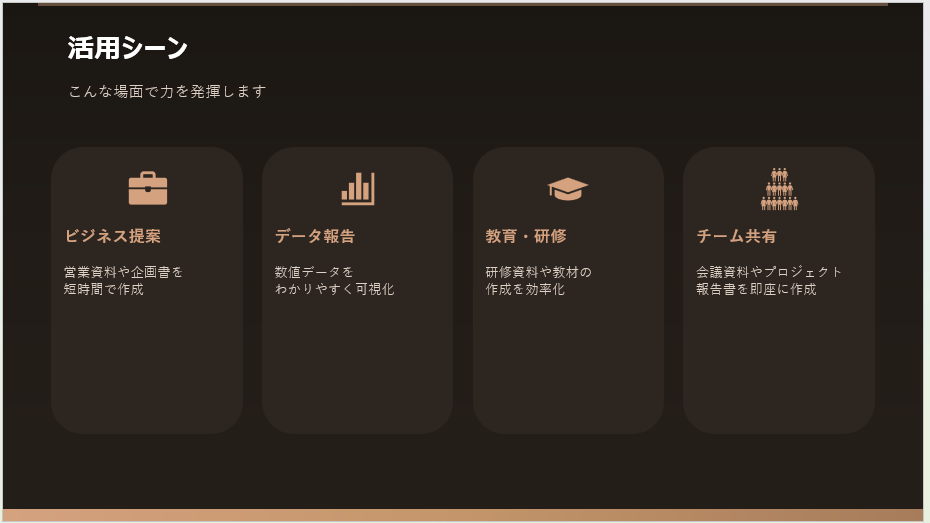 テラコッタカラーをベースにしたデザイン、タイトル・サブタイトル・キャッチコピーまで自動で入れてくれています。しかも「次のスライドに進みましょうか?」と自分から提案してくれます。