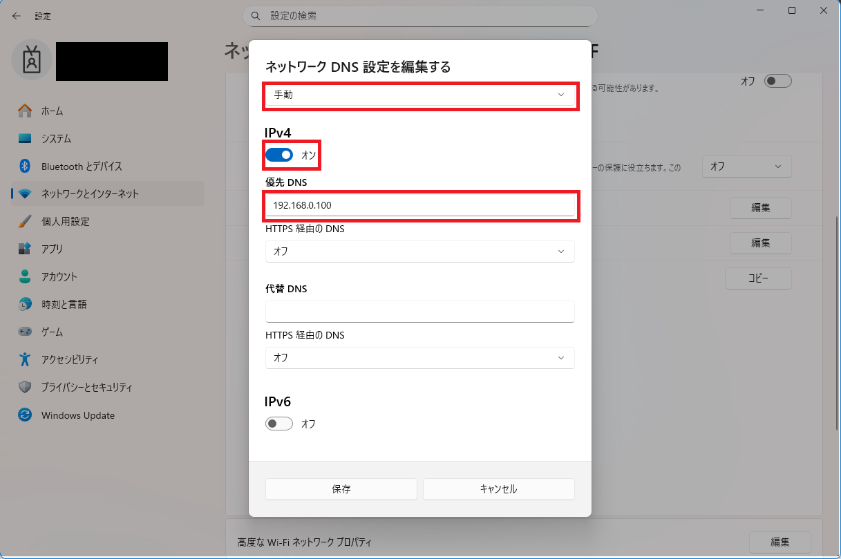 「DNSサーバーの割り当て」という項目があるので、その「編集」を押下します。