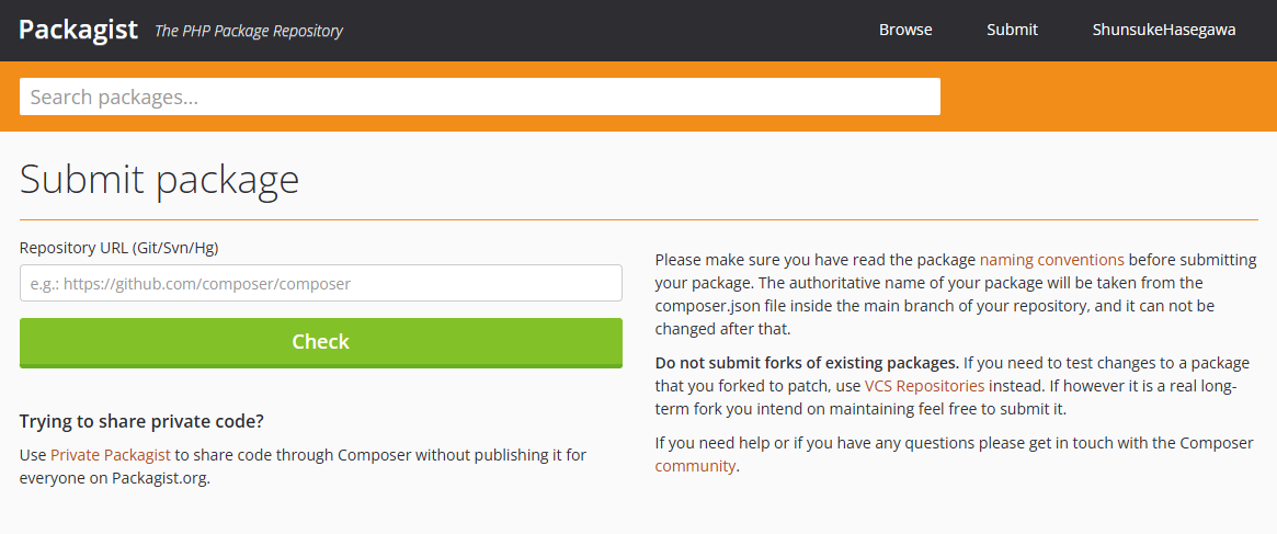 Packagistの登録が完了したら、いよいよパッケージの公開です。